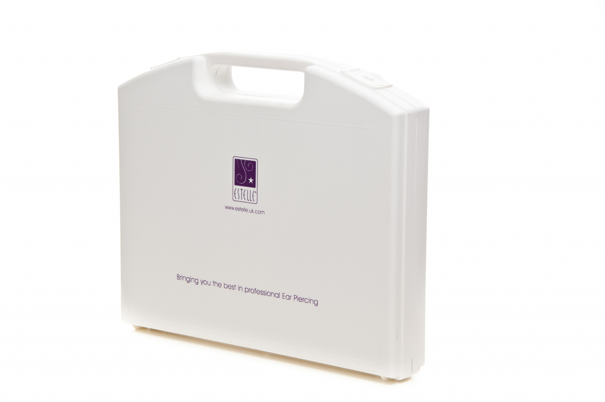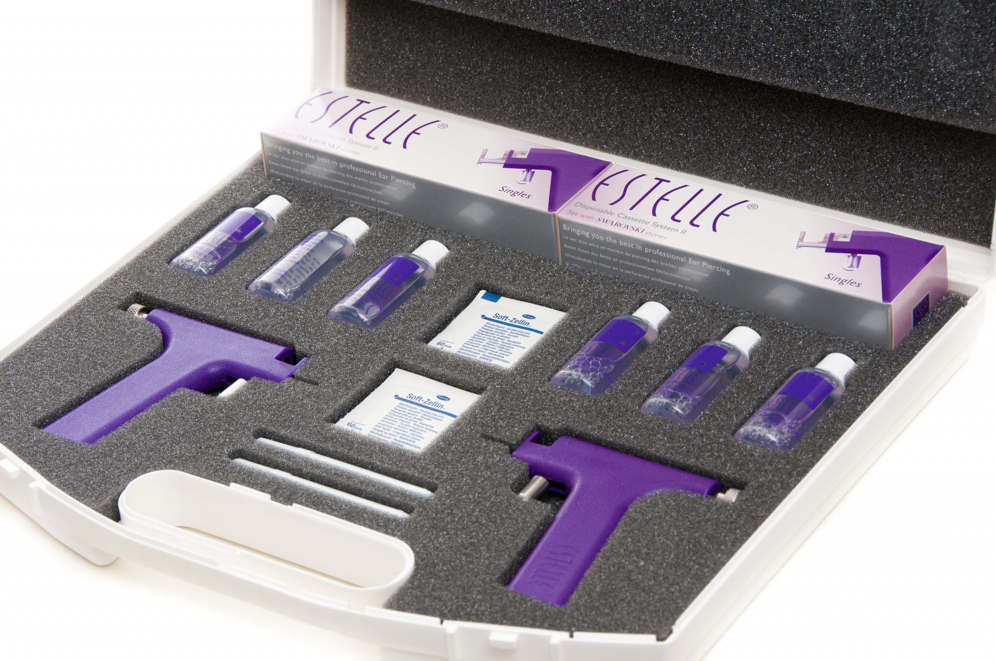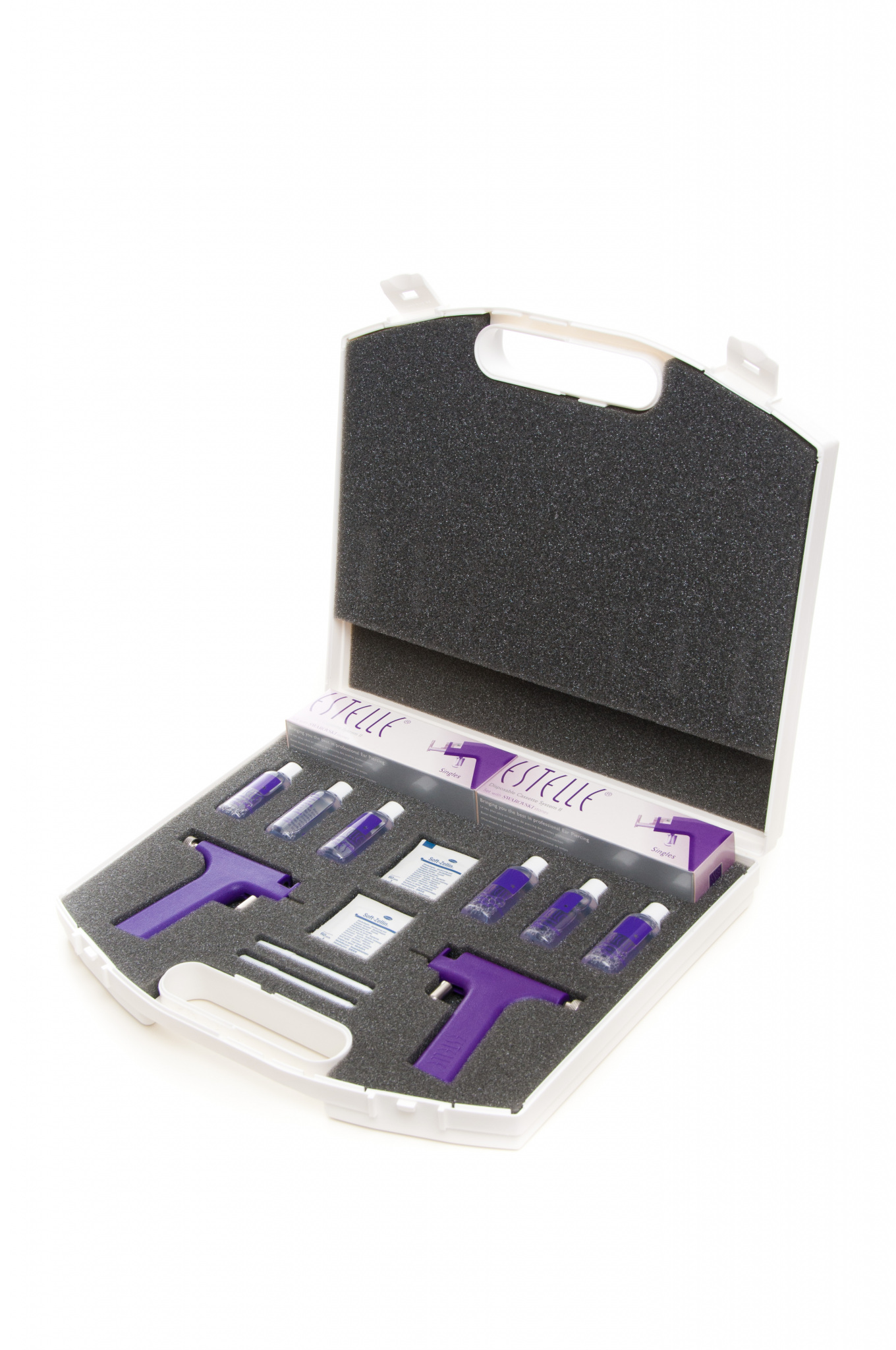 Startovací sada v profesionálním kufříku (2 ks pistole Estelle System II, 2 ks značkovací fix, 6 ks čistící roztok Estelle After Care Solution á 25 ml, antiseptické tampóny, 12 párů náušnic - náušnice MOŽNO INDIVIDUÁLNĚ VYBRAT i dle jednotlivých kusů).